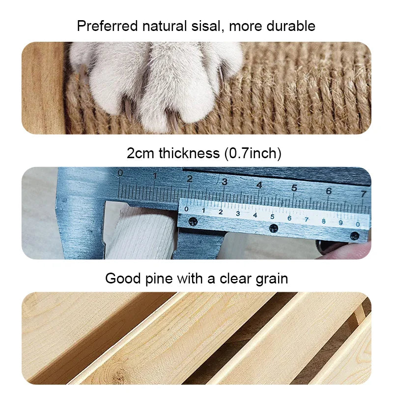 - Matériaux de Qualité : Un mélange de bois solide et de corde de sisal pour un griffoir efficace.