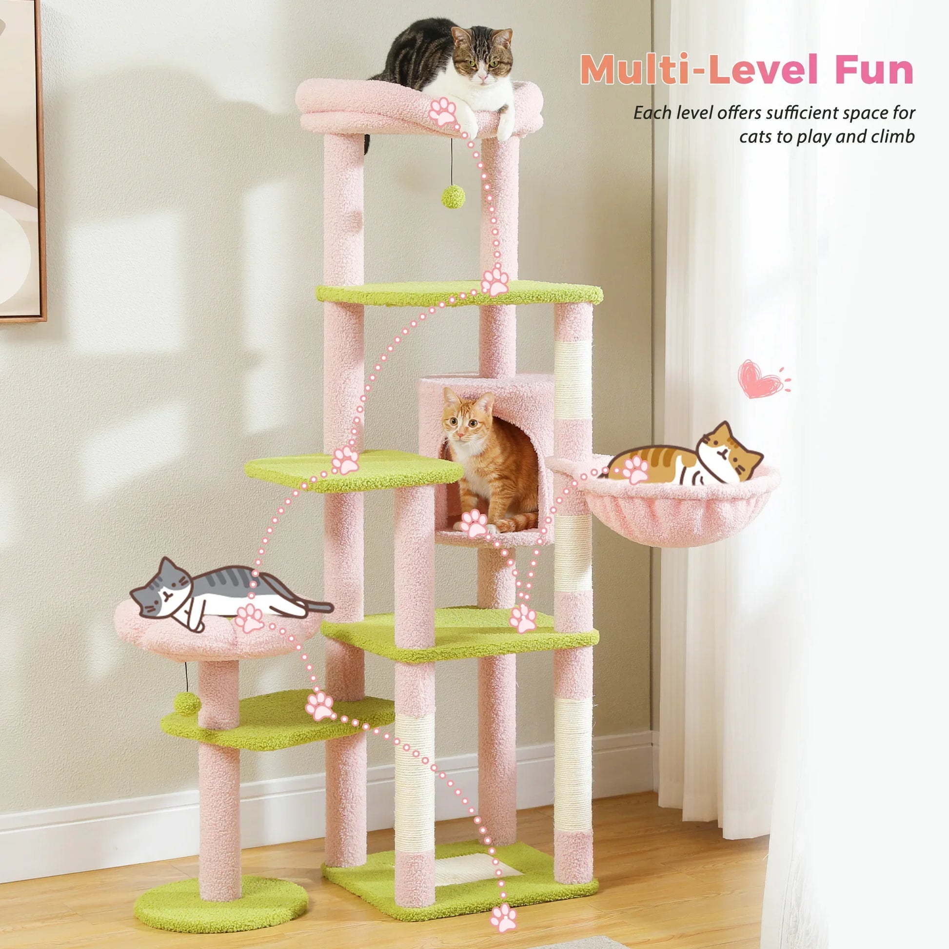 - Plates-formes de Jeu : Multipliez les aventures avec plusieurs niveaux où votre chat pourra grimper, bondir et s'amuser à sa guise.